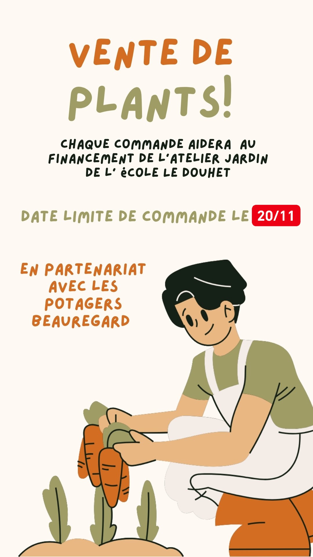 L’école de Le Douhet organise une vente de plants en collaboration avec Les Potagers de Beauregard. 🪴 Les commandes sont ouvertes à tous ! 📅 Date limite de commande : 20 novembre 2025 Merci de passer vos commandes directement auprès de l’école de Le Douhet. Message du directeur de l’école : » Comme l’an passé, nous avons reconduit notre partenariat avec « Les Potagers de…